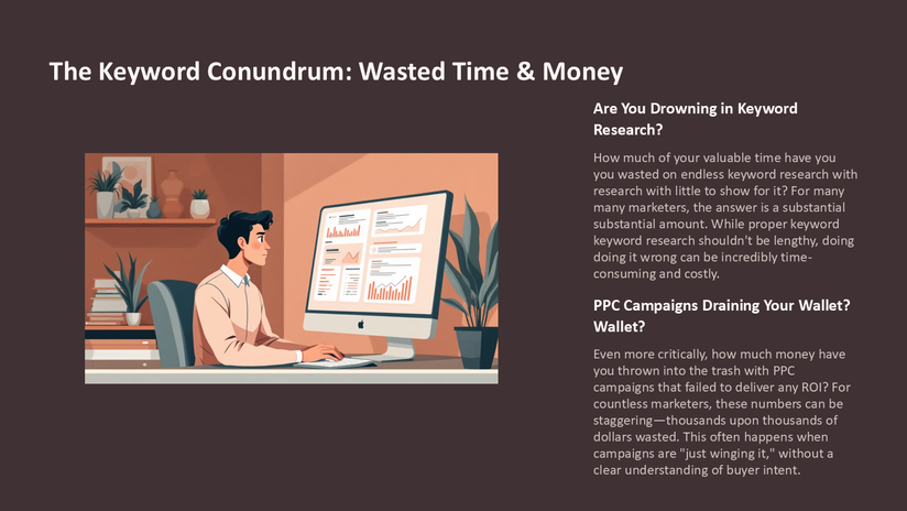 How much of your time have you wasted on doing keyword research?Quite a substantial amount i’ll bet!Truth be told, if you’re going to spend time doing keyword research and want to do it properly, it shouldn’t take long, but if done wrong, it can be very time consuming. . . or expensive! Which leads me to my next question. . .How much money have you thrown in the trash on PPC campaigns that failed to deliver an ROI?In most cases for many marketers, the numbers can get pretty staggering! Thousands upon thousands of dollars wasted simply because they were “just wingin it” and had absolutely no idea what they were doing.Most marketers make the mistake of selecting many keywords without having what I like to call “Buyer Intention.”In other words, they see keywords getting thousands of monthly visits, load them into a PPC campaign, and just expect to see the money roll in.Doing this will only roll in one thing. . .